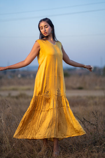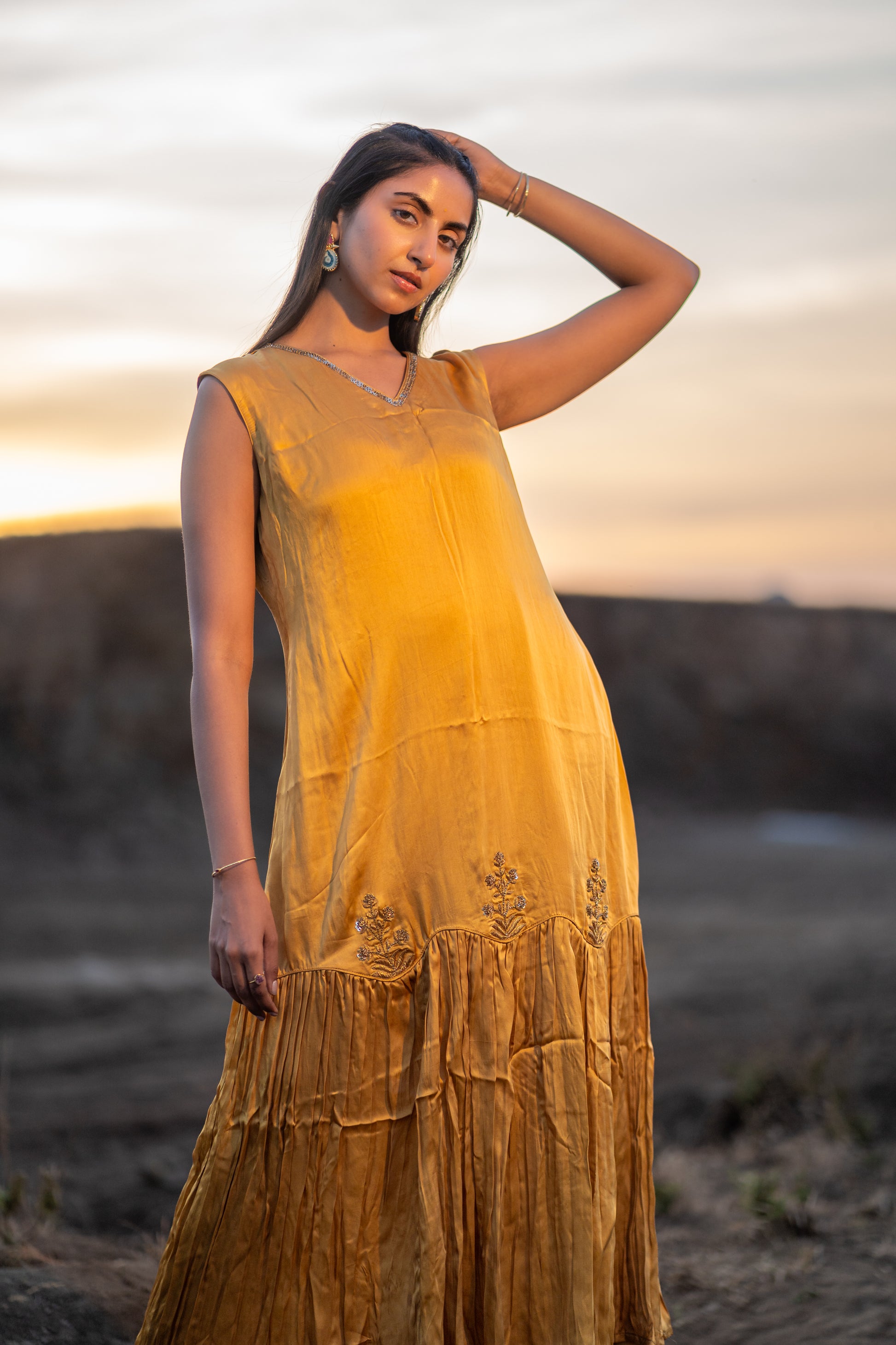 An architectural dance of light, capturing the golden stillness of a restorative sanctuary. The Aurelian Gala choreographs a refined dialogue between structured volume and weightless movement. Realized in a deep ochre palette that celebrates the warm, lustrous glow of the raising sun, the Bemberg Cupro offers a liquid-silk drape with exceptional breathability. Delicate artisanal embroidery and a rhythmic pleated hem add an impeccable finishing touch, honoring a commitment to quiet luxury and organic integrity.