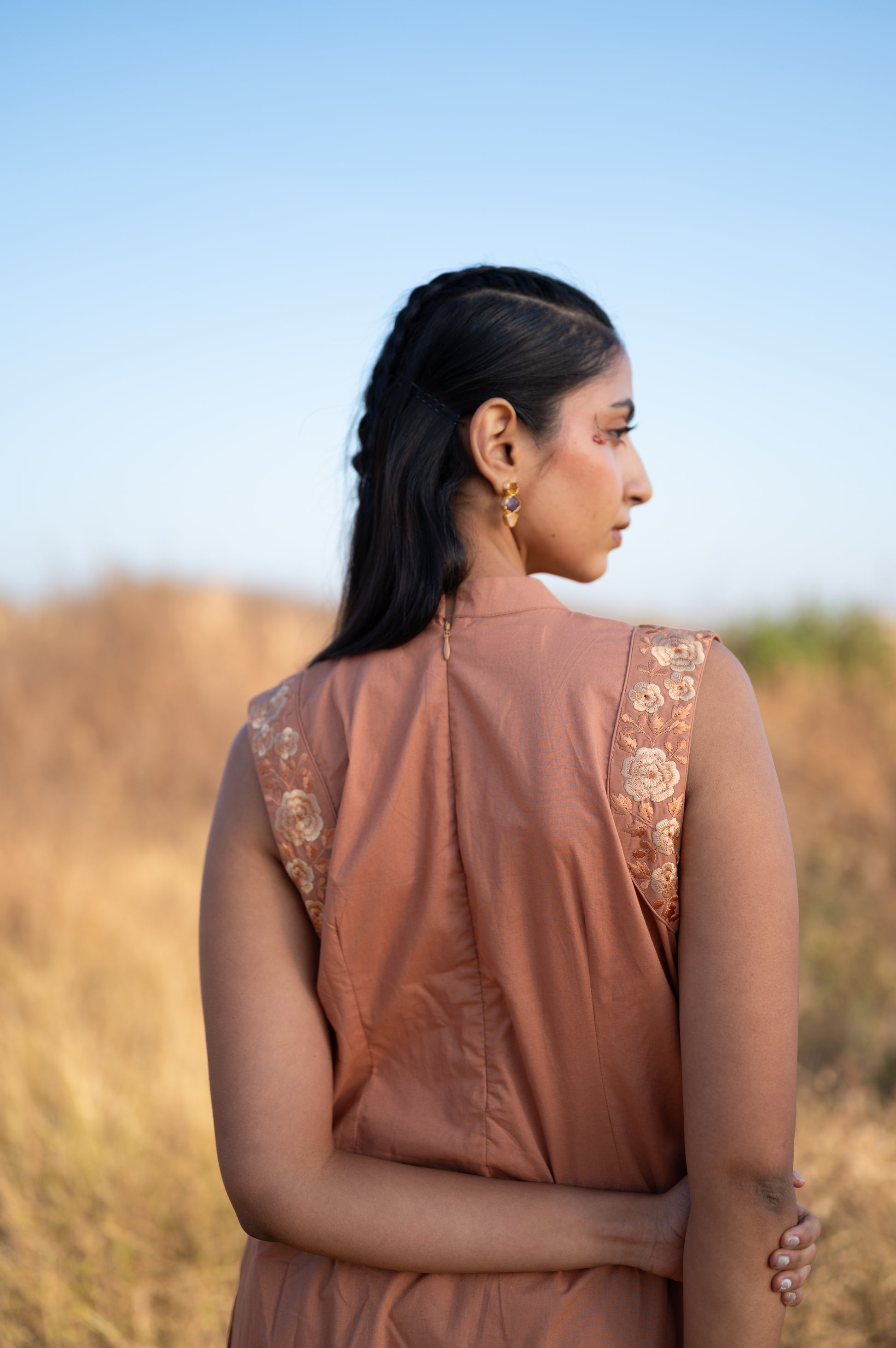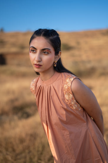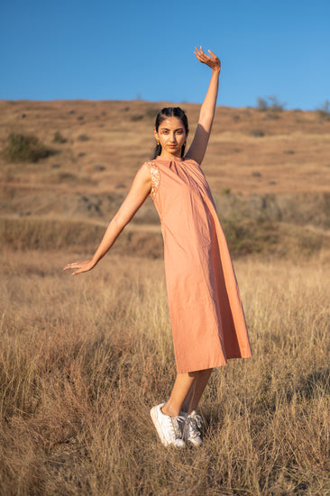 The Desert Rose dress choreographs a refined interplay between the crisp, architectural integrity of organic poplin and a fluid, weightless movement. This piece puts an elegant spin on the sleeveless midi, utilizing a sun-kissed terracotta palette that celebrates the fiber’s most breathable and honest qualities. A meticulously pleated high neckline and tonal floral embroidery at the shoulder add an impeccable finishing touch—offering the Conscious Wanderer a restorative sanctuary layer for moments of graceful exploration.