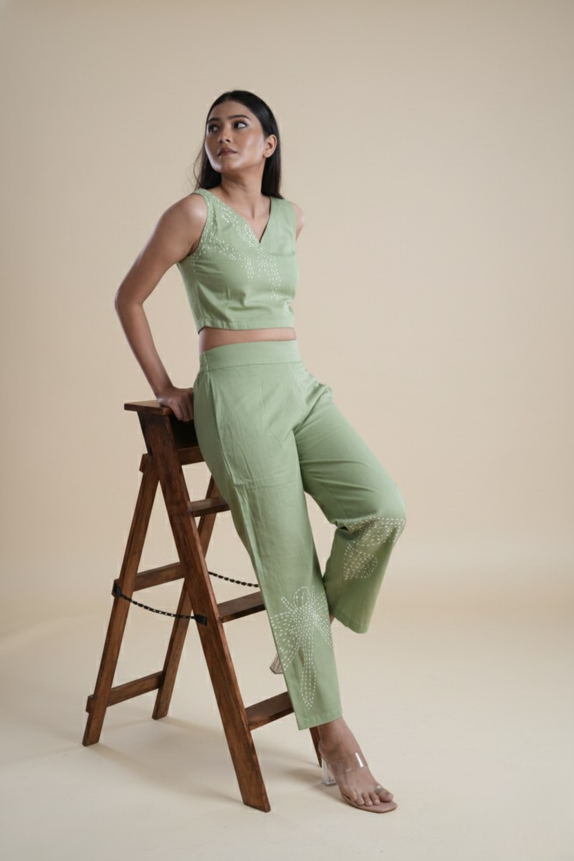 The Embroidery: Intricate, hand-guided artistry elevates the crop top, ensuring no two sets are exactly alike.