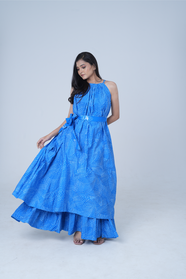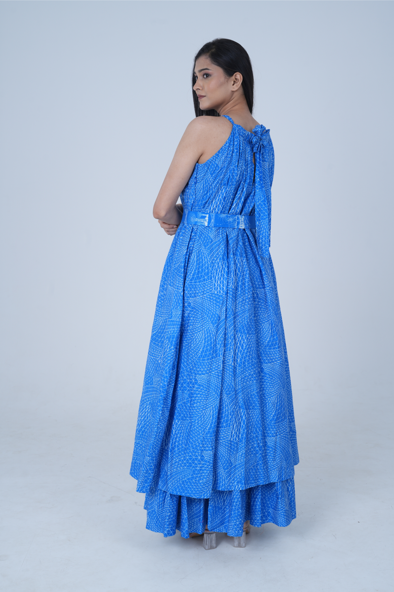 The dress is a long, flowing cascade design that drapes gracefully over the body. Its geometric pattern is inspired by the intricate architecture of Jewel Changi Airport, featuring a mesmerizing interplay of lines and shapes reminiscent of the airport's iconic Rain Vortex. The dress is crafted from a luxurious, fluid fabric that accentuates its cascading silhouette. A slim, tailored fabric belt cinches the waist, defining the wearer's figure and adding a touch of sophistication to the overall look.