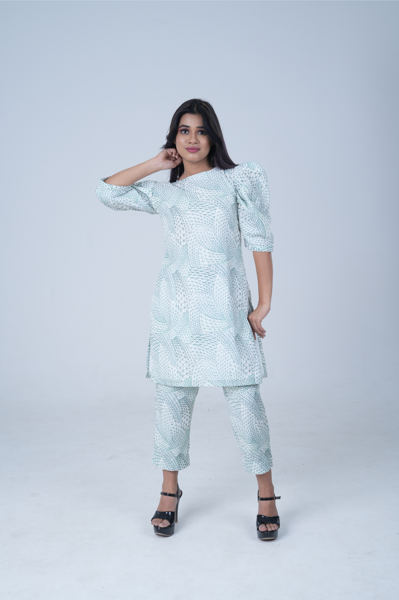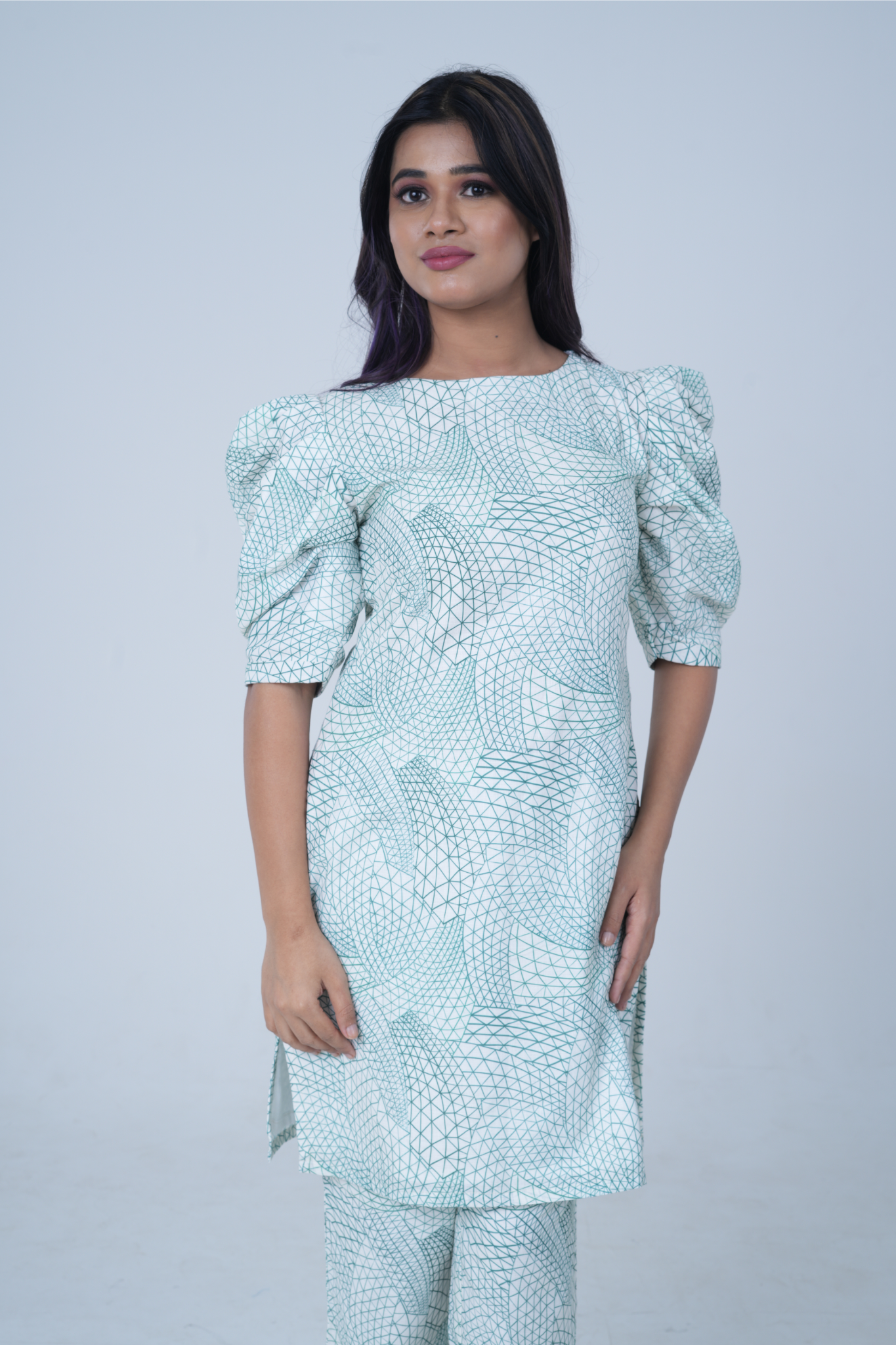 This top and pant set is a unique and stylish piece that celebrates the beauty of architectural design. The comfortable fabric and the striking geometric pattern make it a versatile addition to any wardrobe, perfect for those who appreciate both comfort and fashion.