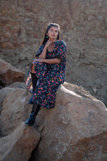 The Midnight Meadow dress choreographs an exquisite interplay between the crisp, structural integrity of Organic cotton and a fluid, feminine movement. This piece puts a luminous spin on the traditional floral midi, utilizing a deep obsidian canvas that celebrates the vivid, honest colors of our organic thread. Delicate puff sleeves and a rhythmic, tiered silhouette add an impeccable finishing touch—offering the Conscious Wanderer a wearable sanctuary that transitions effortlessly from sun-drenched explorations to twilight rituals.