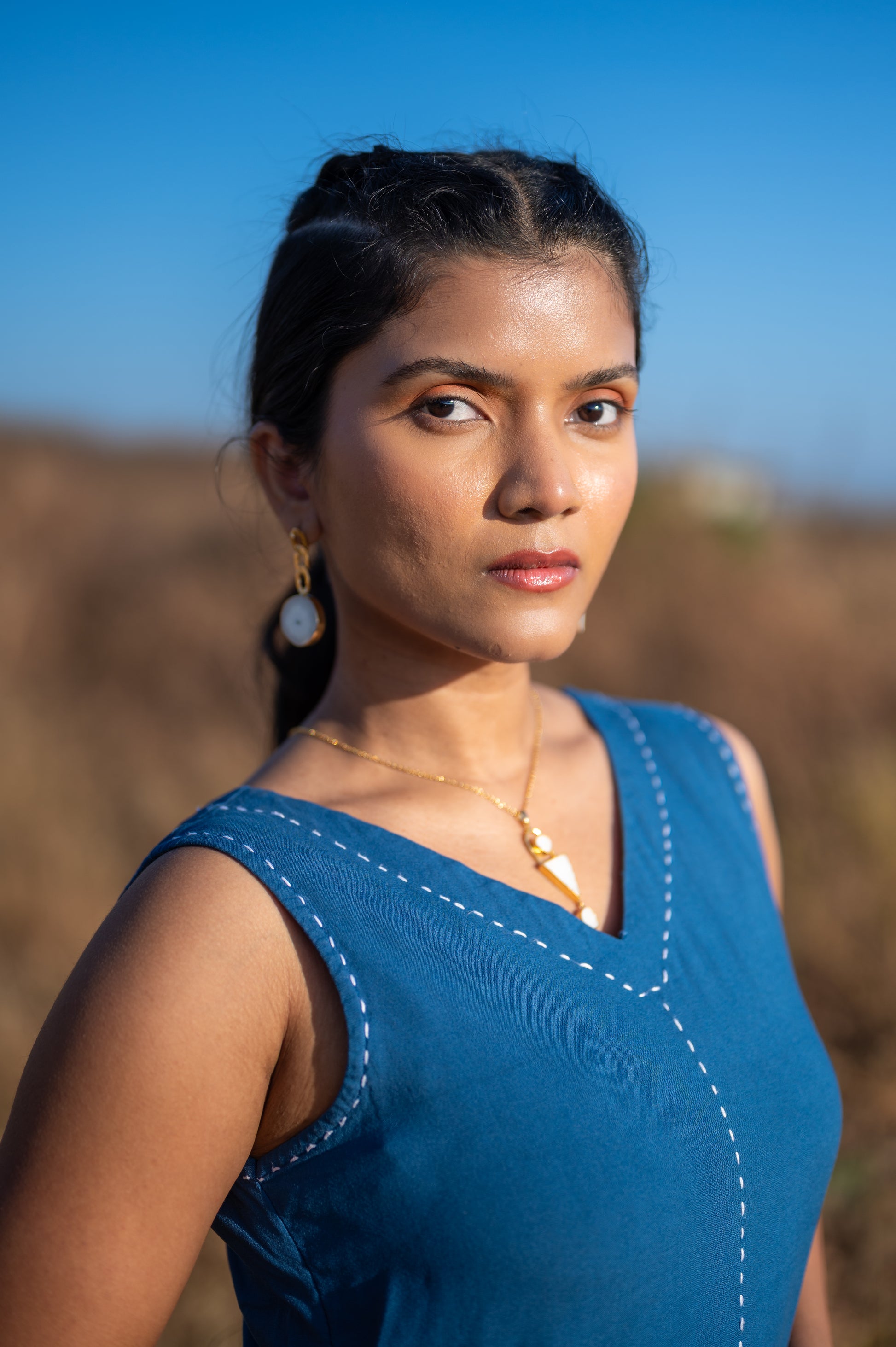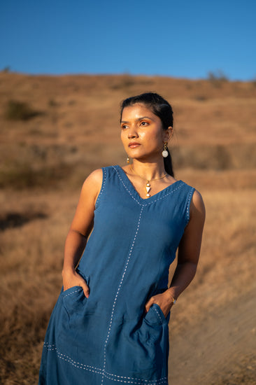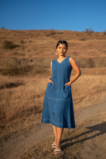 Experience the comfort and eco-consciousness of this ocean blue a-line dress, made from organic fabric. The seamless pockets and elegant design make it a versatile piece, ideal for both work and play. It's not only kind to the planet but also incredibly comfortable for long days of exploring or a relaxing vacation.