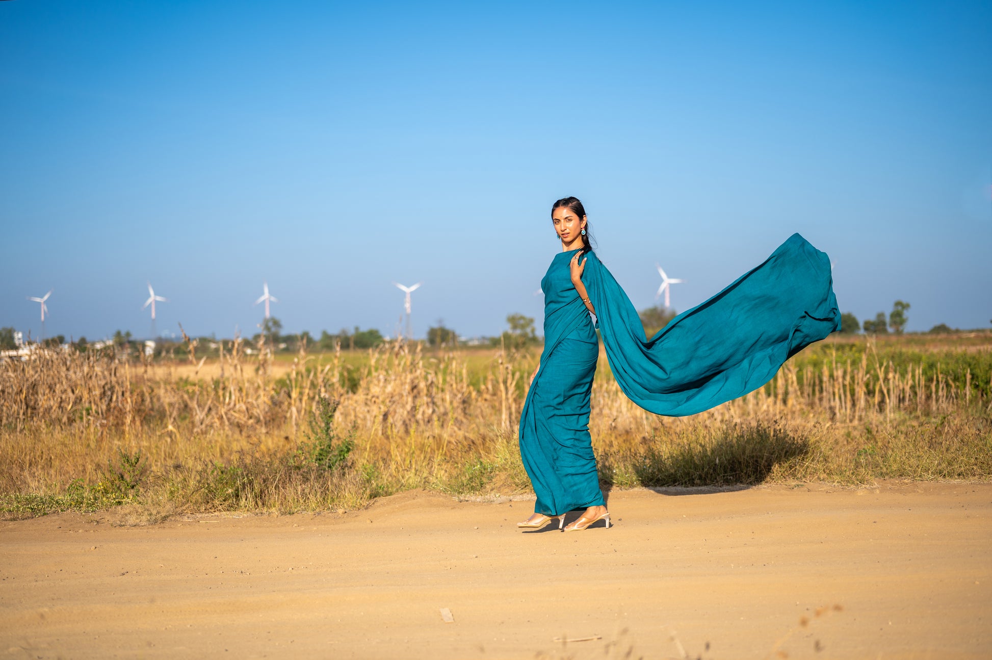 The Silhouette: A minimalist, six-yard drape designed for effortless versatility, allowing for a seamless transition from sunlit afternoons to formal resort evenings.