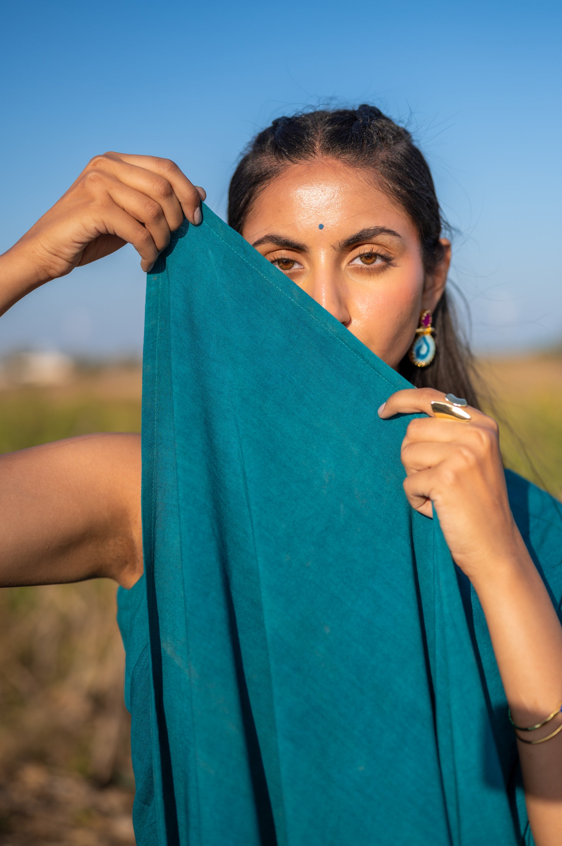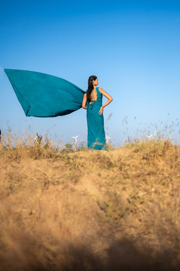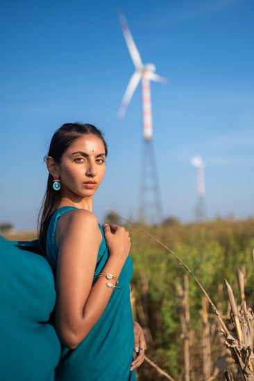 The Peacock Verse Saree choreographs an exquisite interplay between the structural integrity of a traditional drape and the weightless fluidity of Modal fabric. This piece puts a luminous spin on a heritage classic, utilizing a deep teal palette that celebrates the vibrant yet hushed tones of a sanctuary at dusk. The subtle sheen of the organic threads adds an impeccable, silk-like finish that honors both the artisan’s hand and the earth’s rhythm.