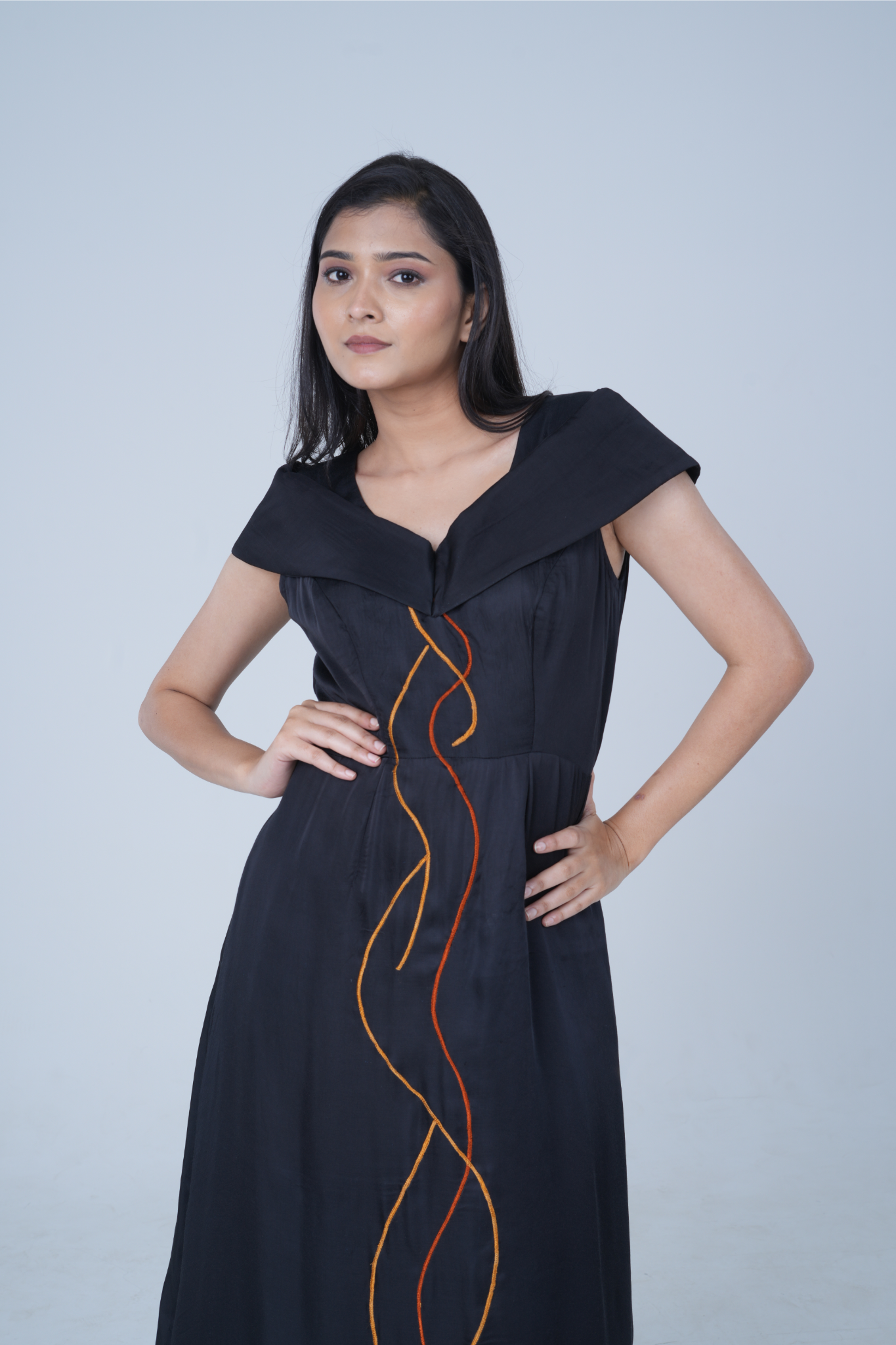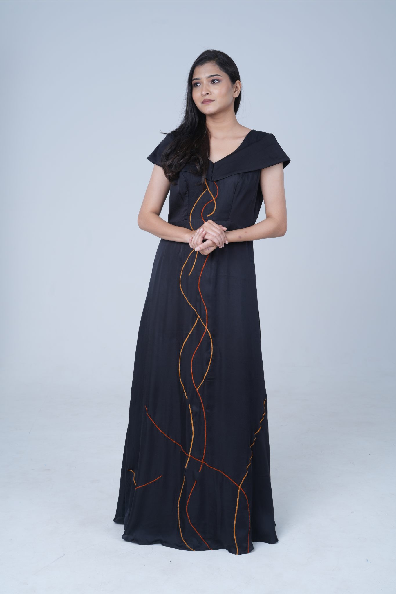 Embroidery: Abstract embroidery in playful, swirling patterns adorns the bodice. This adds a dynamic and artistic element, evoking a sense of movement and spontaneity.