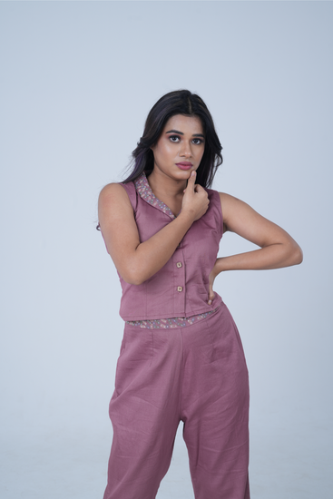 Serenity in Chaos" embodies a co-ord set featuring a crop top with a relaxed fit and wide-leg pants, designed to evoke depth and dimension amidst contrast and chaos. The ensemble harmonizes structured lines in its embroidery, seamlessly blending order with complexity.