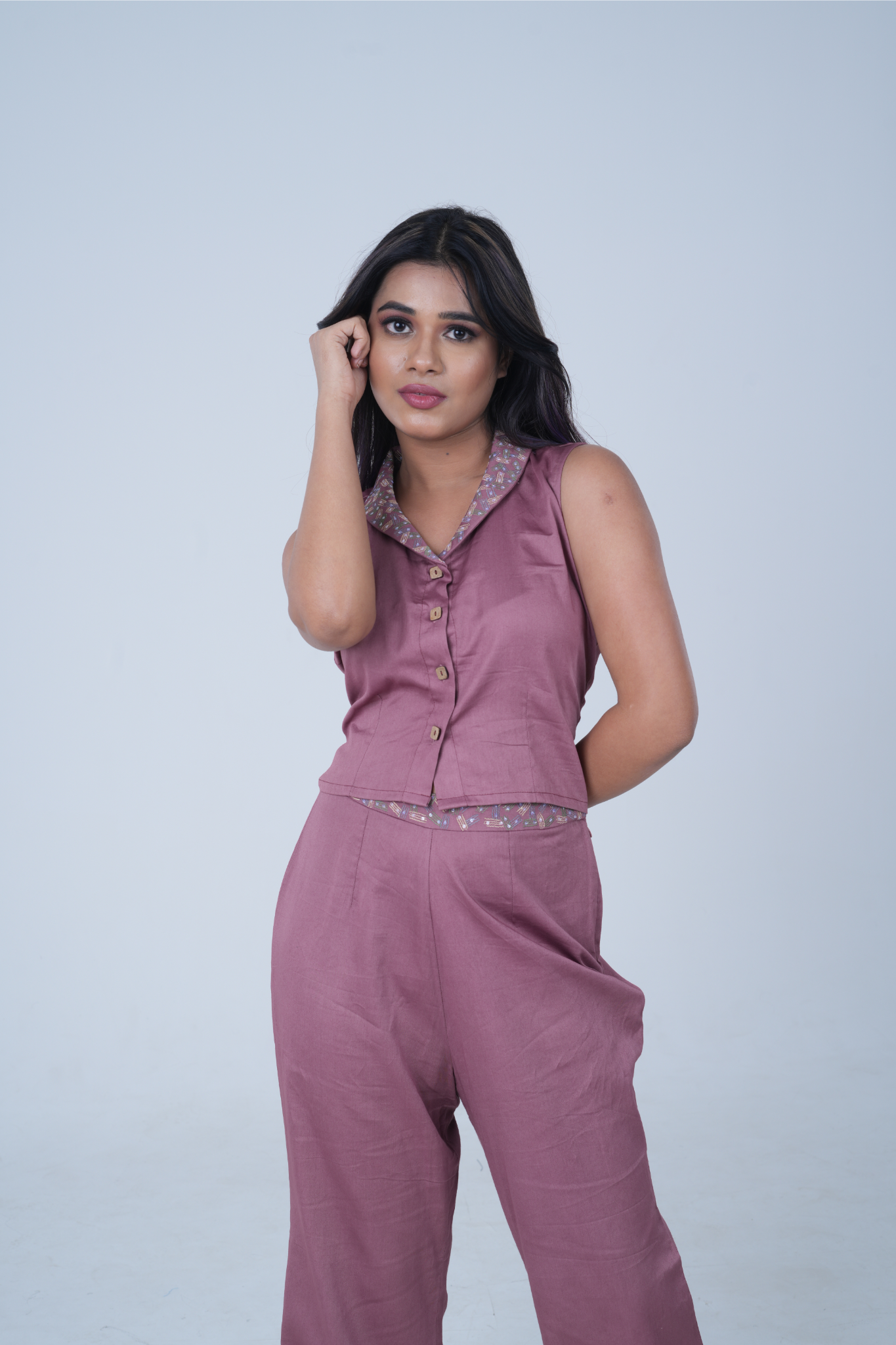 Each detail symbolizes the beauty found in the midst of turmoil, offering a serene yet bold statement. The crop top ensures comfort and style, while the wide-leg pants provide ease of movement and a contemporary flair. This ensemble invites wearers to embrace the balance between tranquility and dynamic energy, celebrating the intricacies of life's journey.