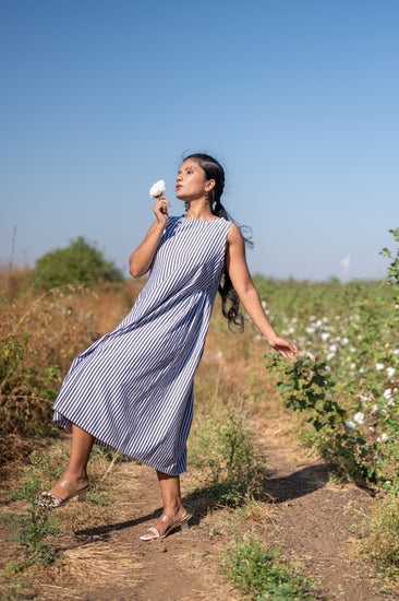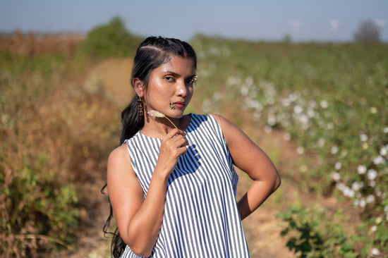 The Silent Slate dress choreographs an exquisite interplay between the structural integrity of Organic cotton and a fluid, weightless silhouette. This piece puts a refined spin on the classic sleeveless shift, utilizing a monochromatic stripe palette that celebrates the fiber’s most breathable and honest qualities. The vertical rhythm of the weave adds an impeccable, lengthening finish—offering the Conscious Wanderer a wearable sanctuary of modern minimalism and organic ease.
