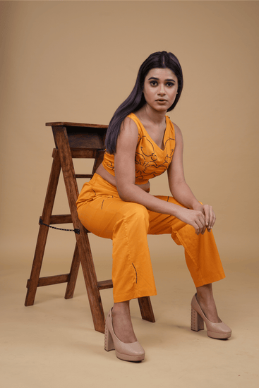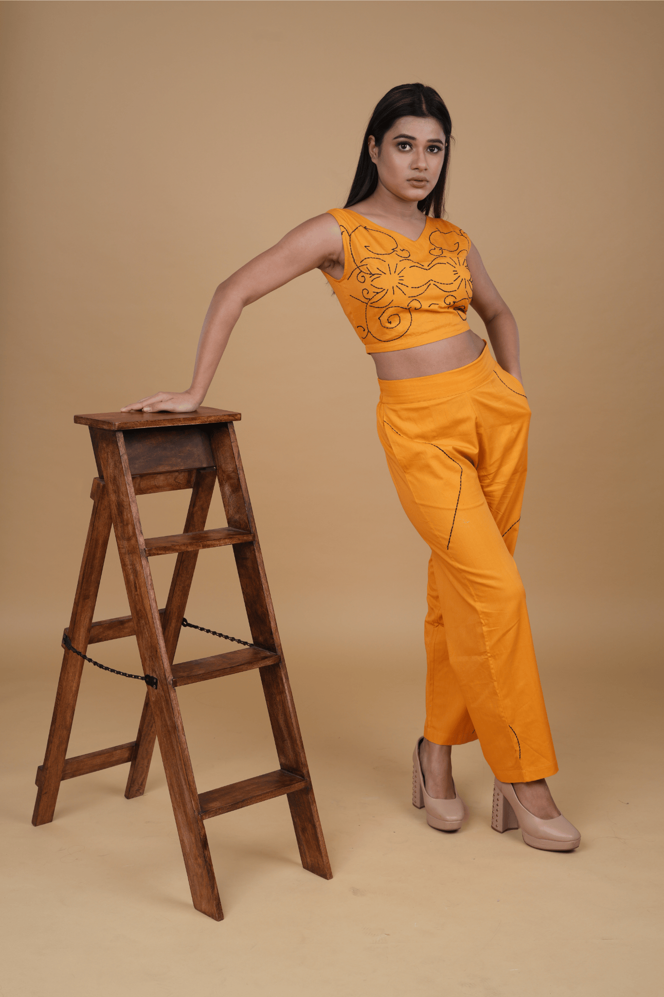 This captivating Yellow Ensemble is a testament to intricate artistry. The Crop Top showcases a bold Web Hand embroidery, while delicate web extensions adorn the Pants, creating a mesmerizing interplay of textures and patterns. Crafted from GOTS certified organic fabric, this ensemble is as sustainable as it is stunning.