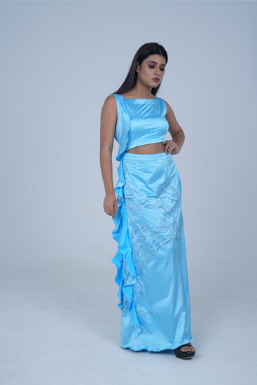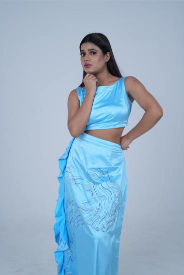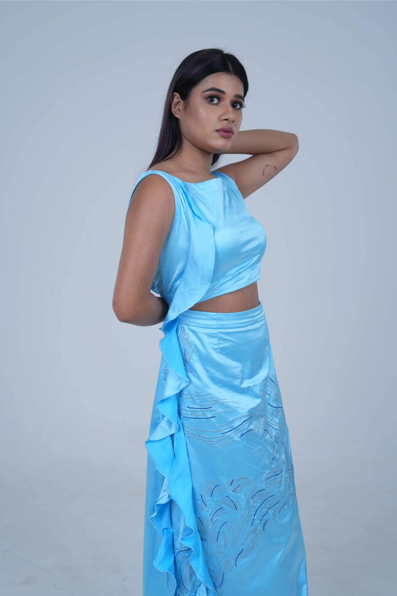 "Whispering Winds" introduces a graceful dress adorned with gentle flounces that cascade delicately, inspired by the fluidity of air currents. Its abstract embroidery captures a whimsical interpretation, blending powder Blue with soft hues of ash and royal blue. This harmonious palette evokes the serene beauty of nature's whispers, symbolizing tranquility and movement in every stitch.