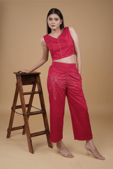 Experience the comfort and style of our Red Crop Top set, made from luxuriously soft GOTS certified organic fabric.The top features a captivating center embroidery, while the pants boast a unique dragonfly motif extending gracefully along both sides.