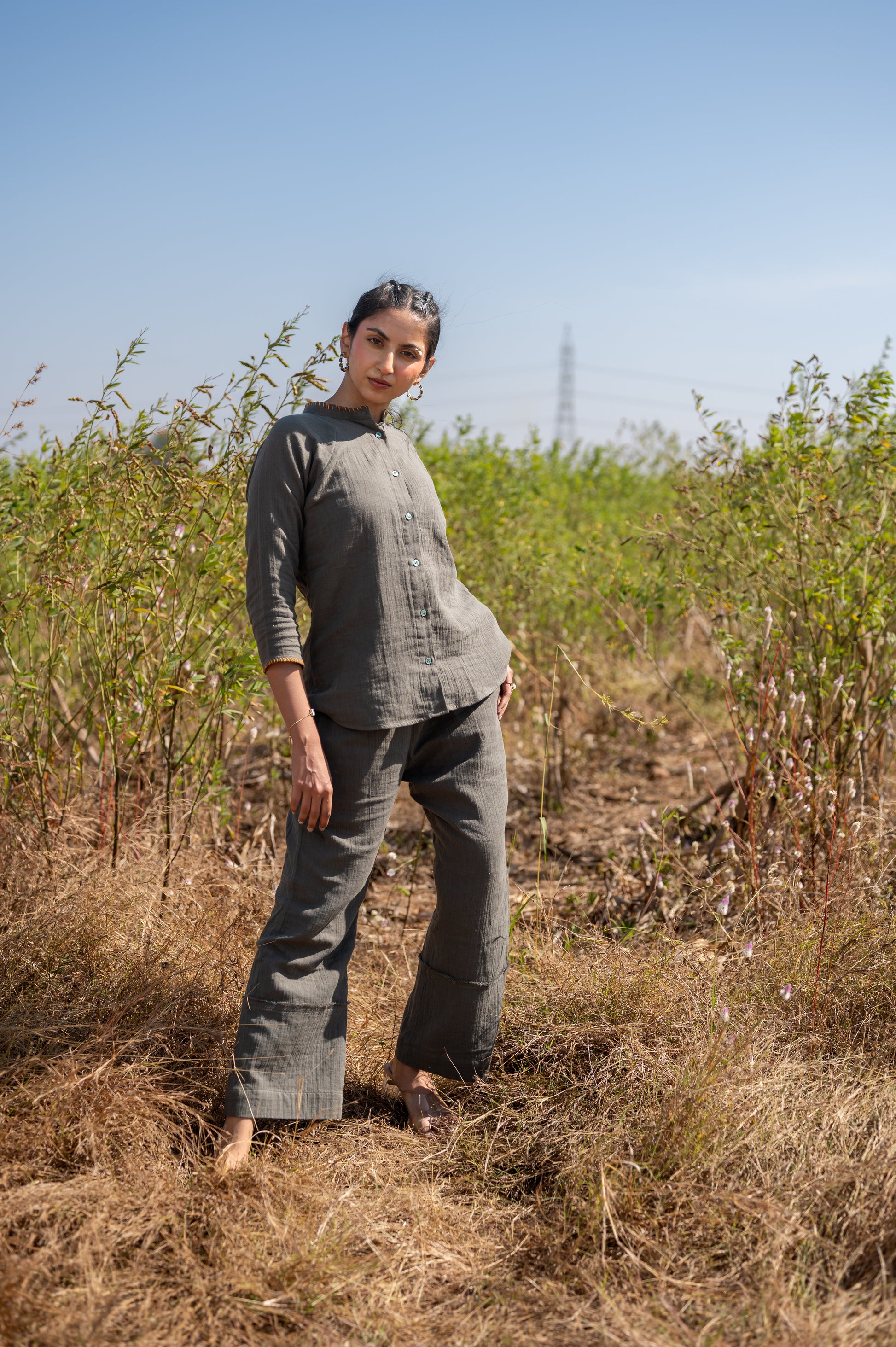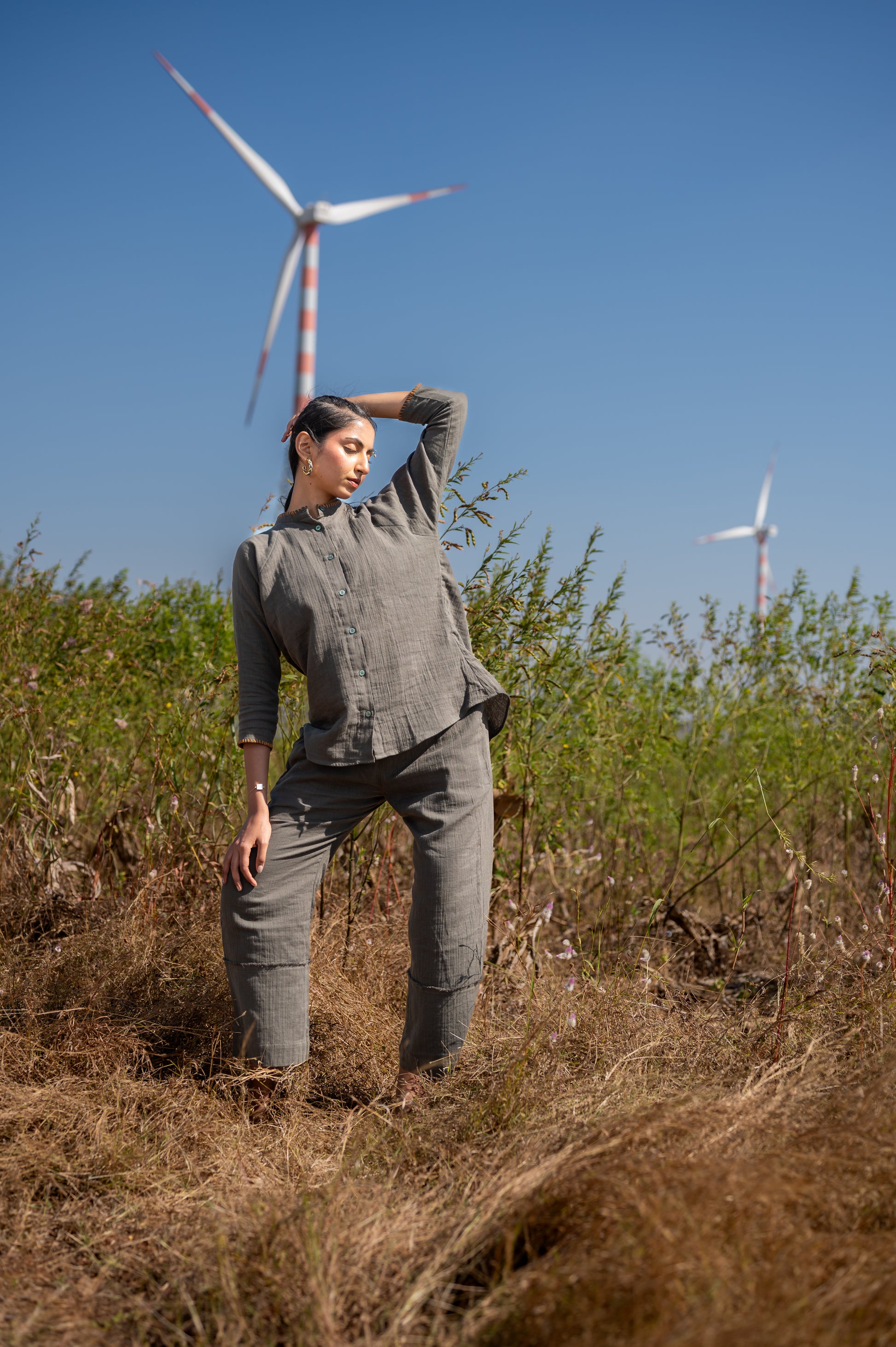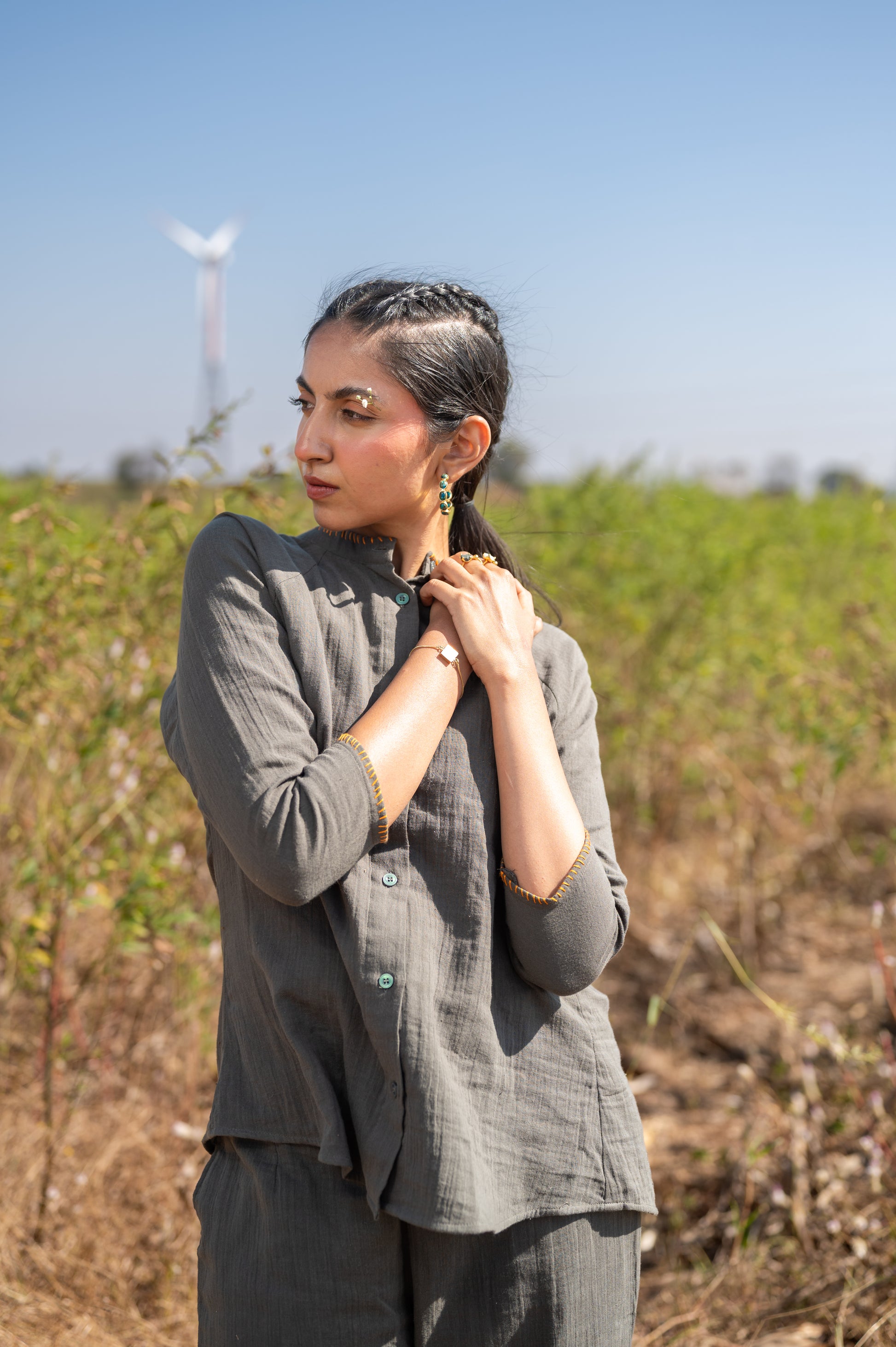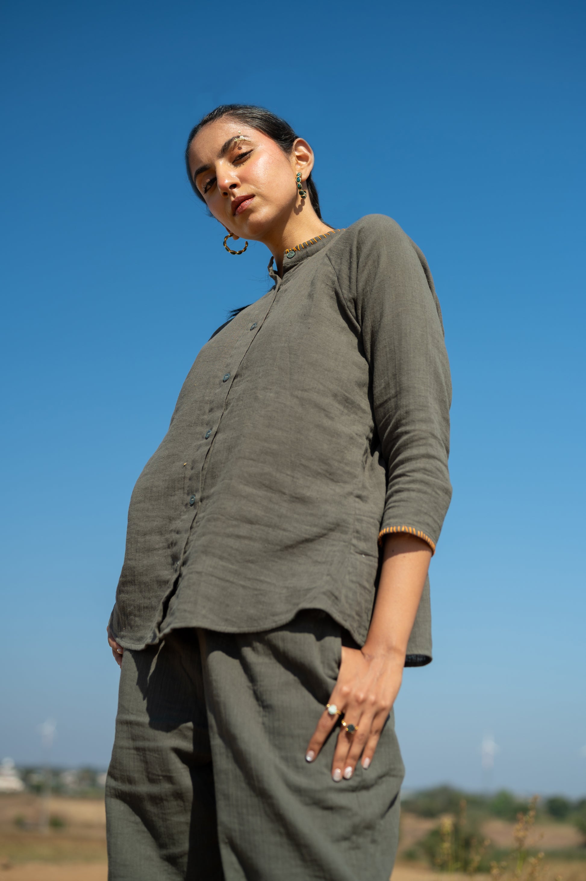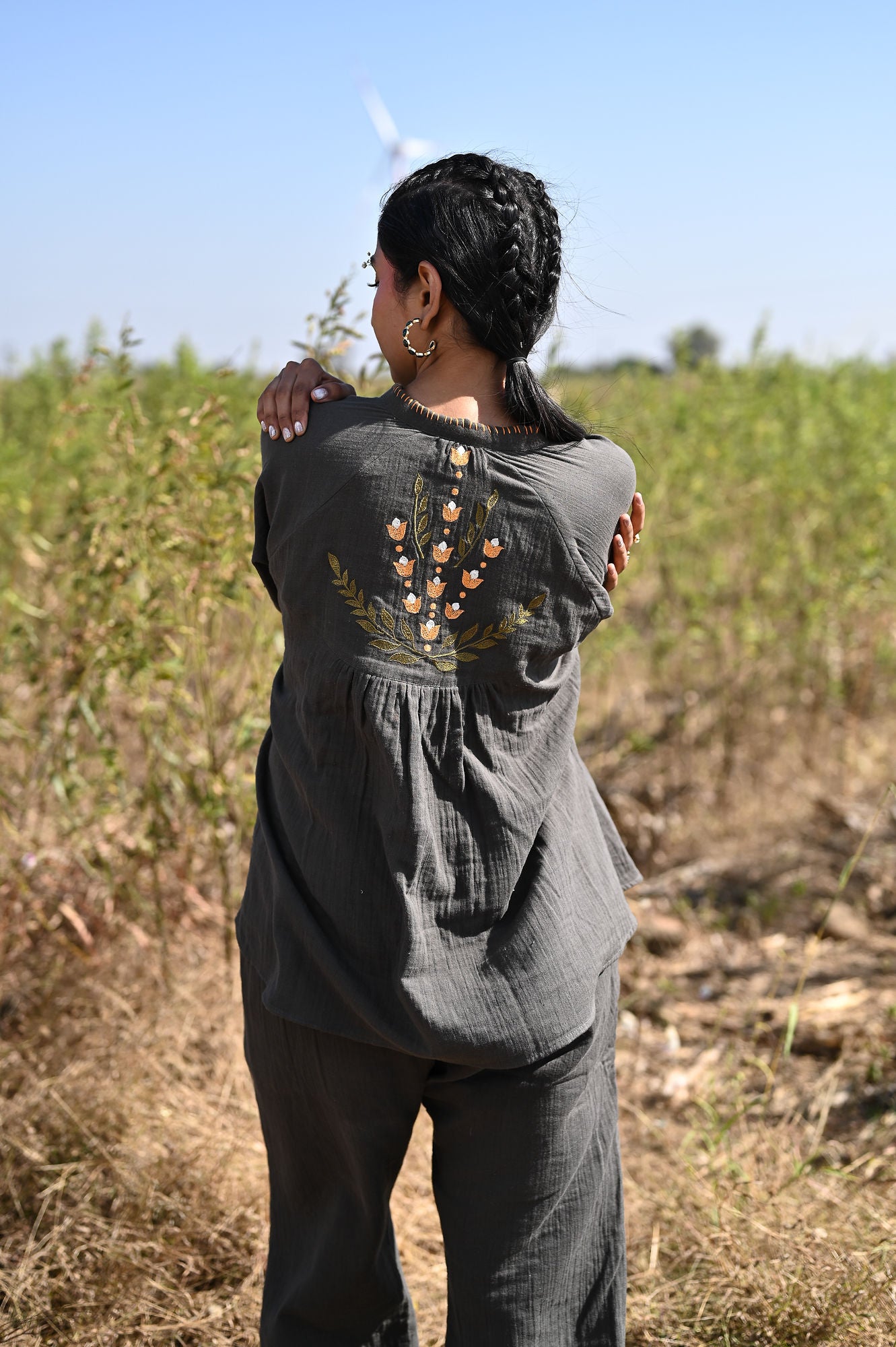 The Zephyr set choreographs an exquisite interplay between the textured, pillowy integrity of Organic double gauze and a relaxed, architectural silhouette. This ensemble puts a refined spin on the classic coordinates, utilizing a Basalt Green palette that celebrates the fiber’s most precious, breathable qualities. A hidden "pas de deux" of hand-embroidered floral motifs across the back adds an impeccable, artisanal finish—offering the Conscious Wanderer a wearable sanctuary of honest, organic grace.